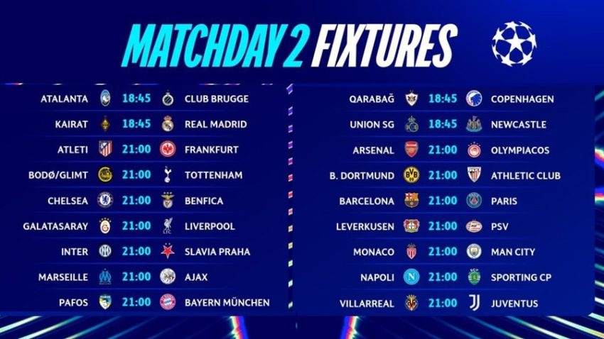 Ֆուտբոլի եվրոպական Չեմպիոնների լիգայում սեպտեմբերի 30-ին եւ հոկտեմբերի 1-ին տեղի կունենան երկրորդ տուրի հանդիպումները։