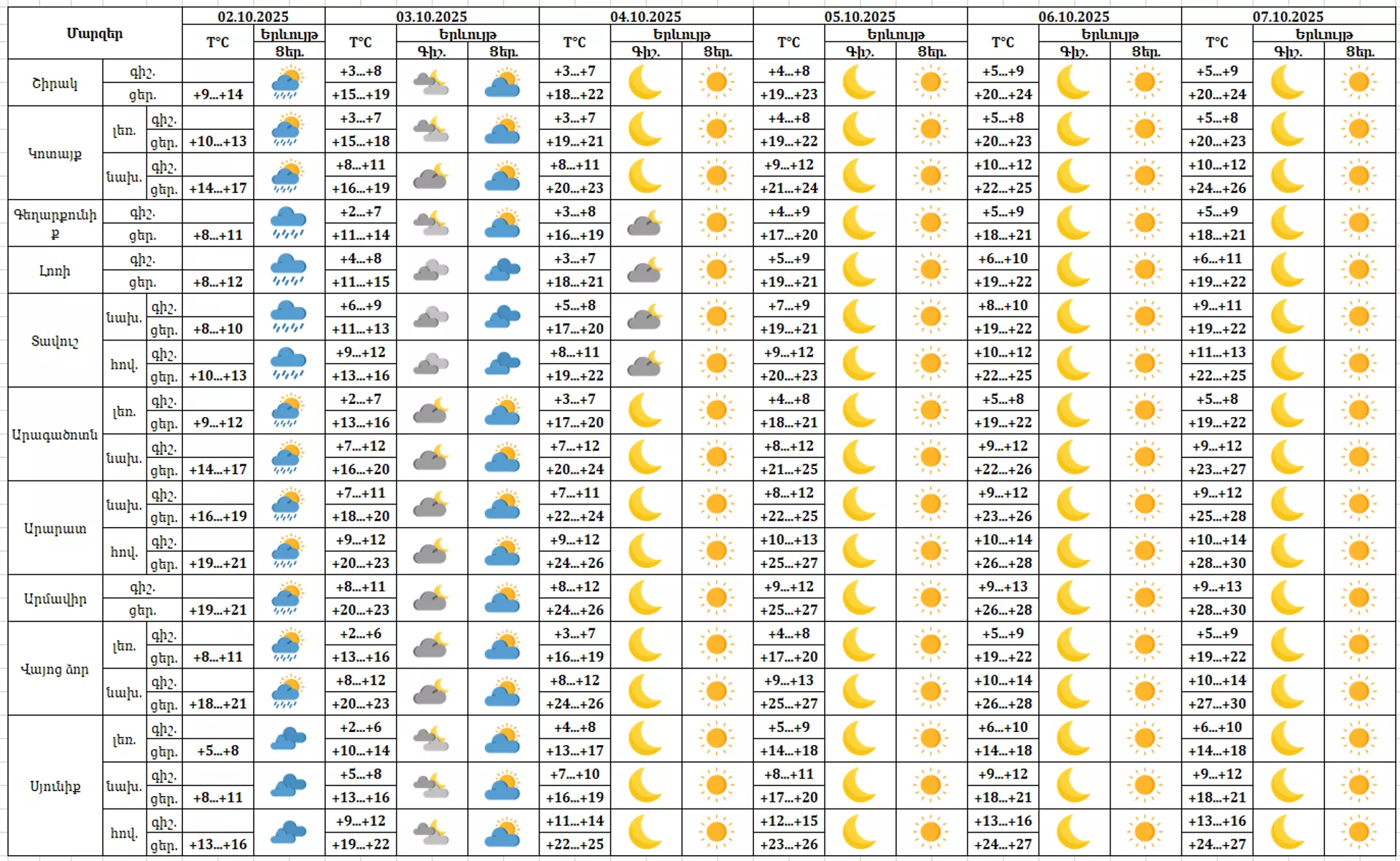 Այսօր և առաջիկա երեք օրերին Հայաստանում անձրև չի գա։ Տեղեկությունը հայտնում է Հիդրոօդերևութաբանության և մոնիտորինգի կենտրոնը։ «Օդի ջերմաստիճանը հոկտեմբերի 3-7-ին աստիճանաբար կբարձրանա 8-10 աստիճանով»,– ասված է հաղորդագրությունում։ Այսօր Երևանում ցերեկային ժամերին օդի ջերմաստիճանը կտատանվի +20-22, գիշերը` +9-11 աստիճանի սահմաններում։ Twitter