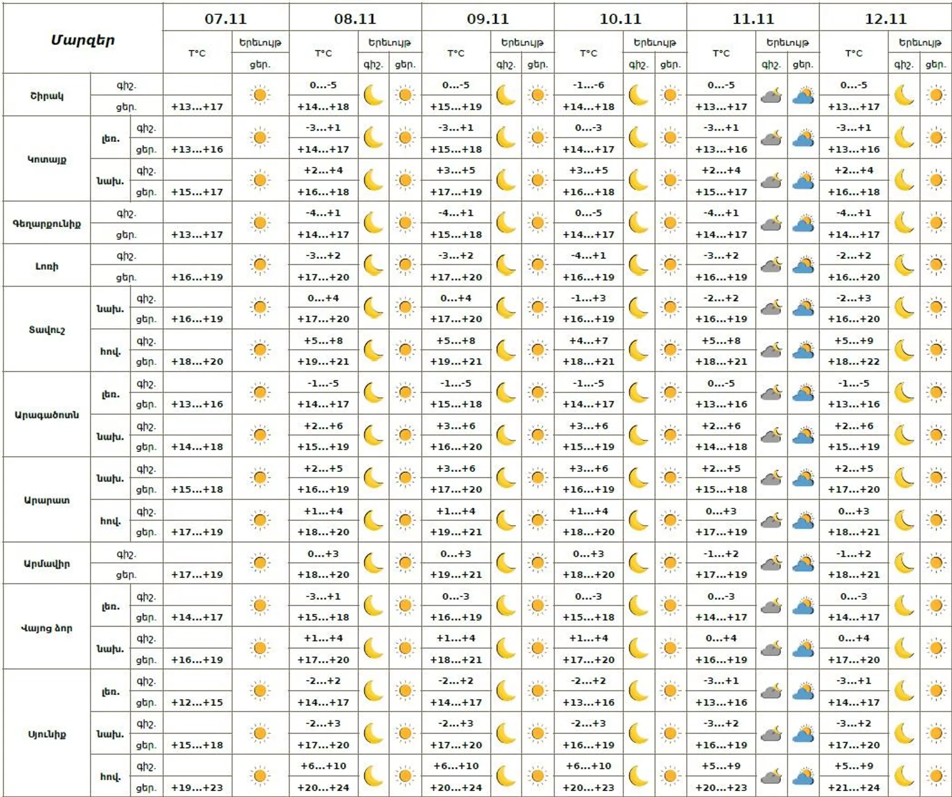 Հայաստանի Հանրապետության տարածքում նոյեմբերի 8-12-ին սպասվում է առանց տեղումների եղանակ: Տեղեկությունը հայտնում է Հիդրոօդերևութաբանության և մոնիտորինգի կենտրոնը։