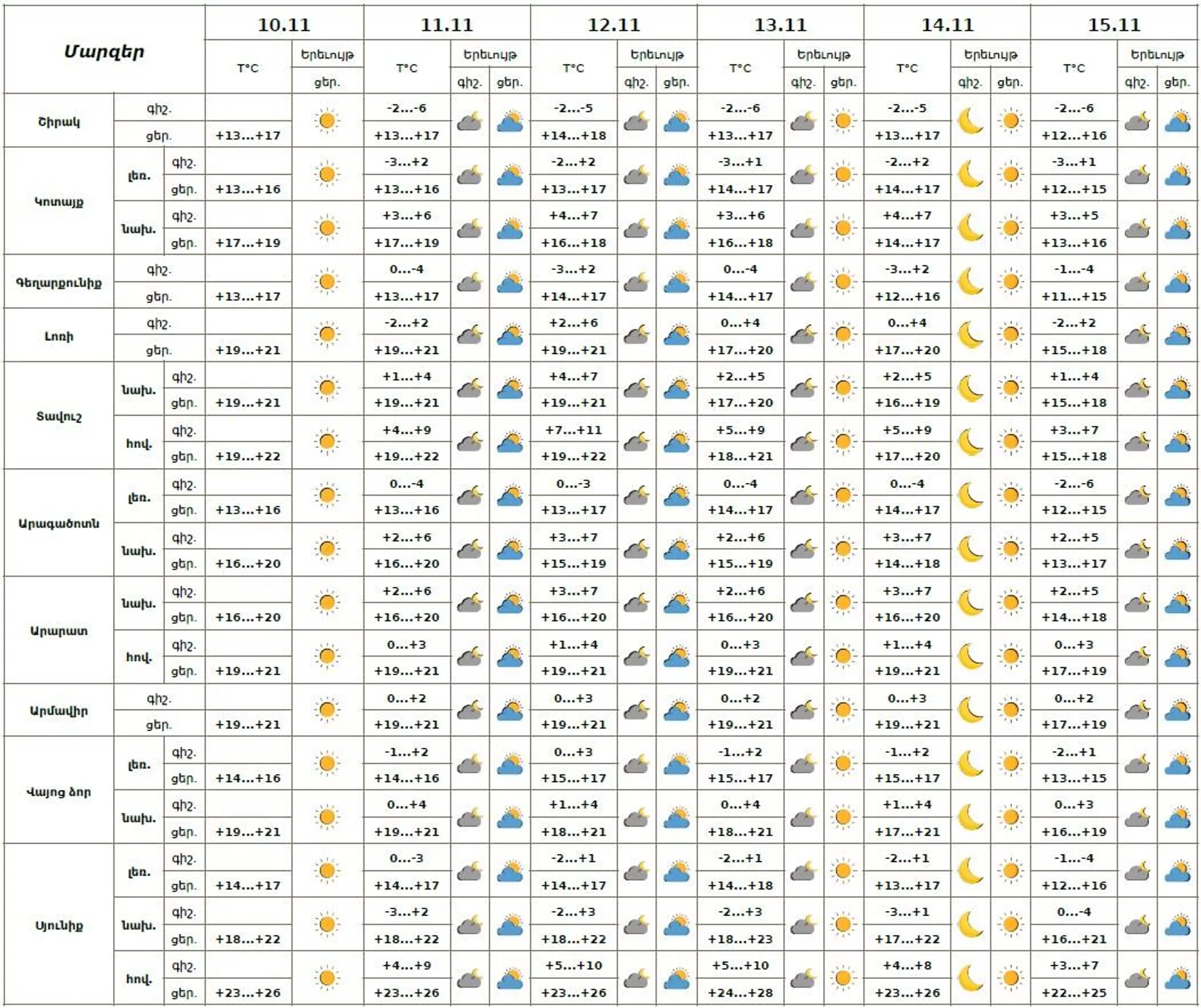 Երևան քաղաքում ևս նոյեմբերի 11-15-ին սպասվում է առանց տեղումների եղանակ։ Մայրաքաղաքում նոյեմբերի 11-ի ցերեկը կլինի 18-20 աստիճան տաքություն, իսկ երեկոյան ժամերին կգրանցվի +10...+12 աստիճան։
