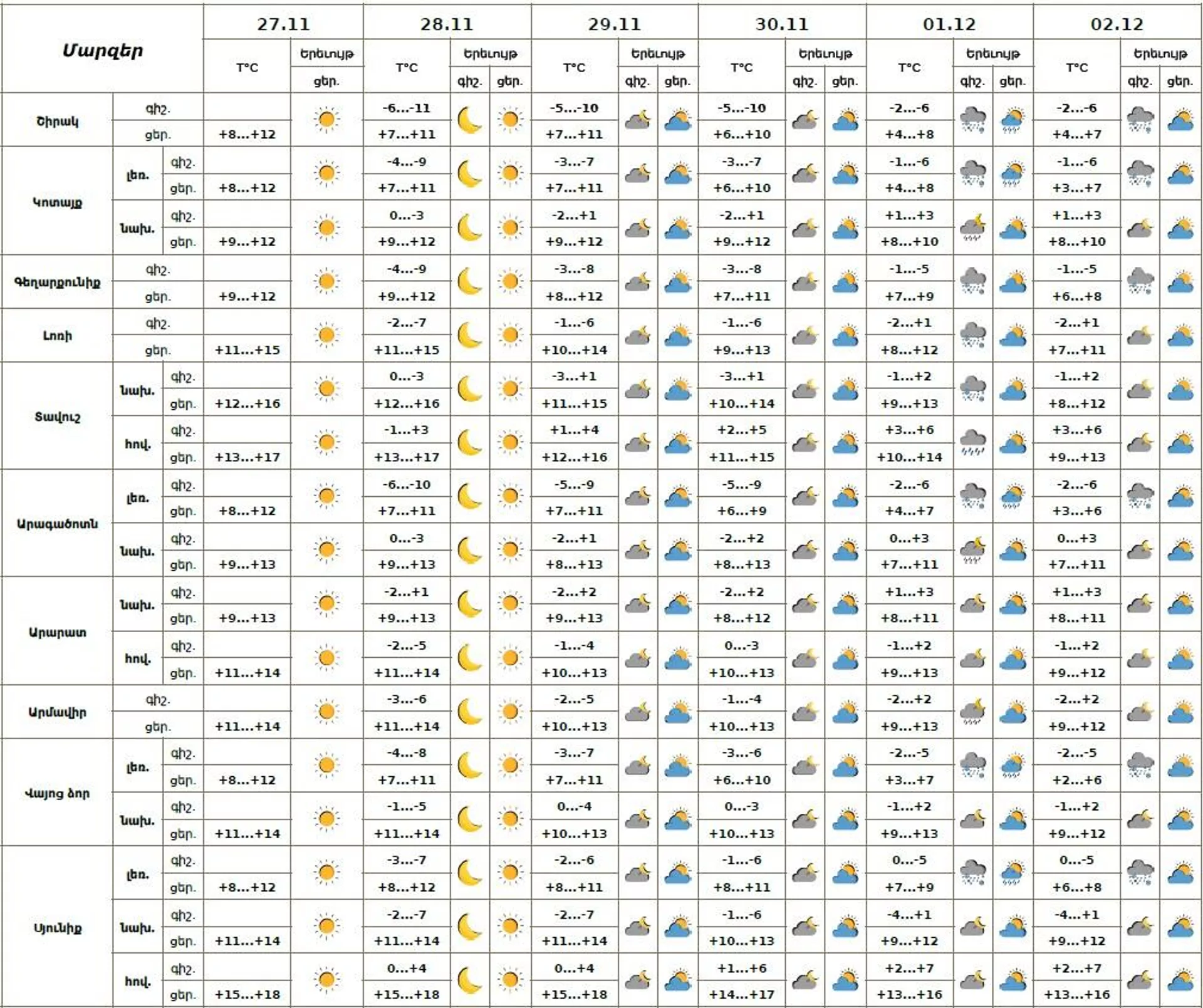 «Դեկտեմբերի 1-ին, 2-ի գիշերն առանձին շրջաններում սպասվում են տեղումներ»,–ասված է հաղորդագրությունում: